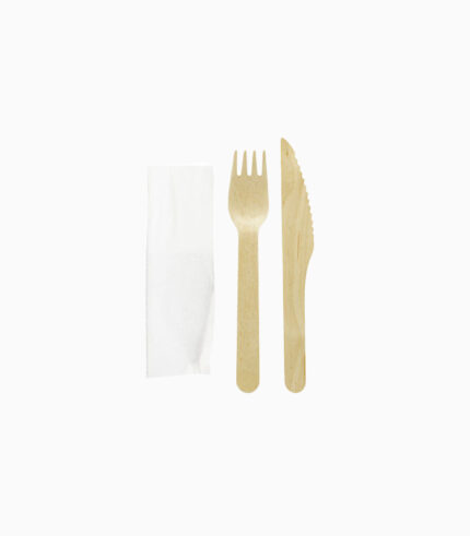 Set lingura, furculita si cutit din lemn de unica folosinta cu servetel alb, in ambalaj sigilat.